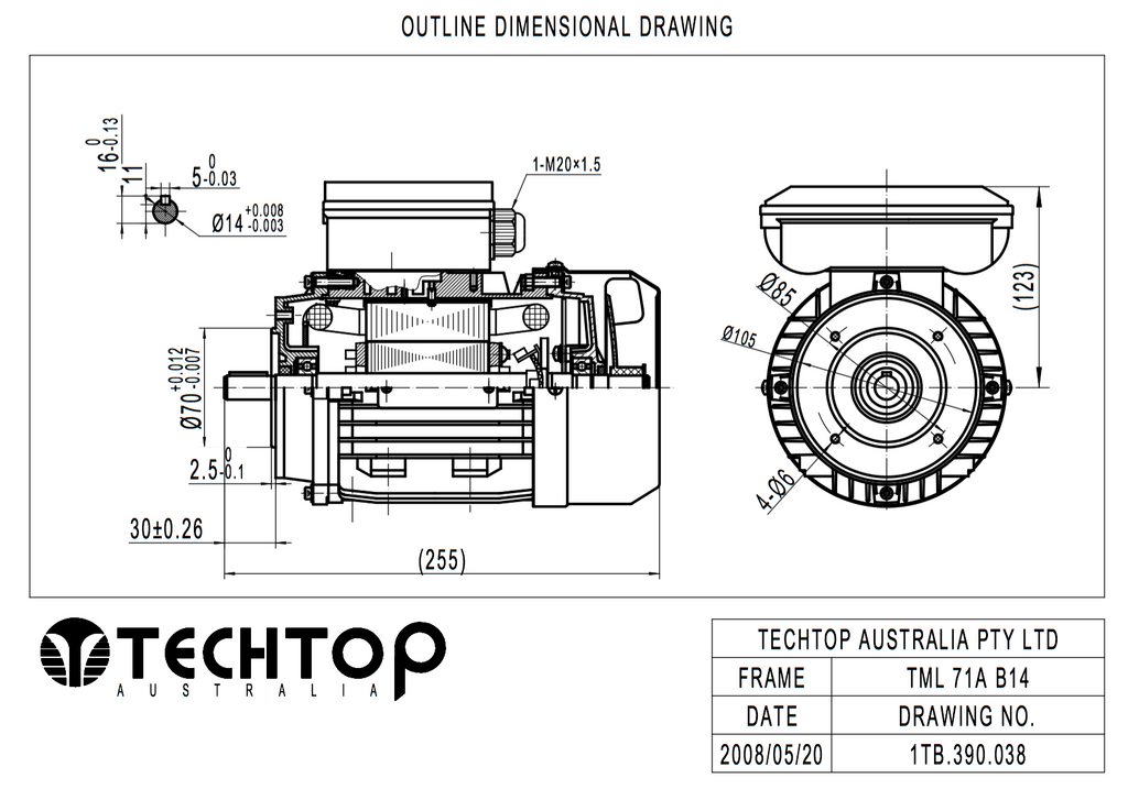 Single Phase Electric Motor 0.55kW 0.75HP 2Pole (2790rpm) 240v CSCR B14A Flange Mounted D71B-2 T/O IP55